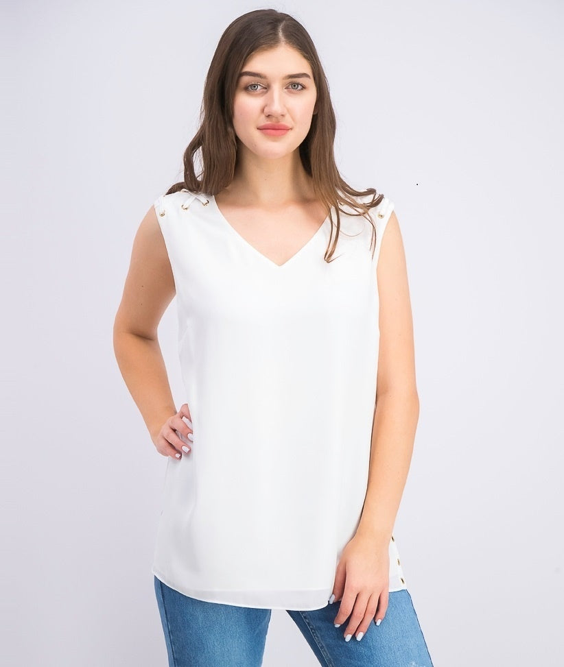 Ajuste relaxado; comprimento aproximado: 21" | Devido ao tamanho generoso, sugerimos um tamanho menor para um ajuste perfeito | Gola redonda | Detalhes de ilhós no decote; amarração na bainha frontal | Poliéster/rayon/elastano | Lavável à máquina