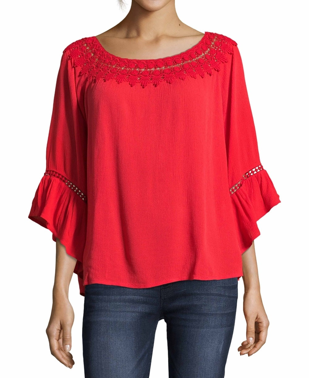 Corte solto | Decote canoa | Acabamento em crochê | Mangas 3/4 sino | Rayon | Lavável à máquina