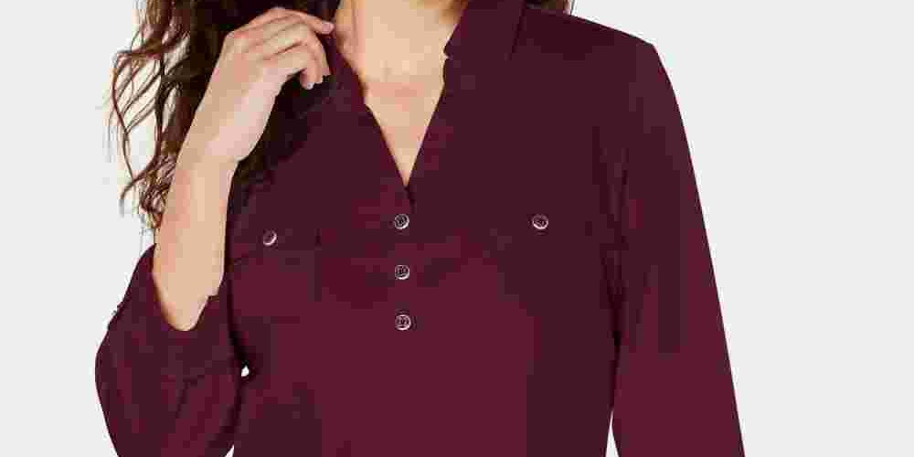 Ajuste relaxado; atinge o quadril; aprox. 26-1/2 de comprimento | Devido ao tamanho generoso; sugerimos um tamanho menor para um ajuste perfeito | Gola Johnny com detalhes em botões | Bolsos com aba de botão no peito | Mangas 3/4 com punhos com aba dobrada