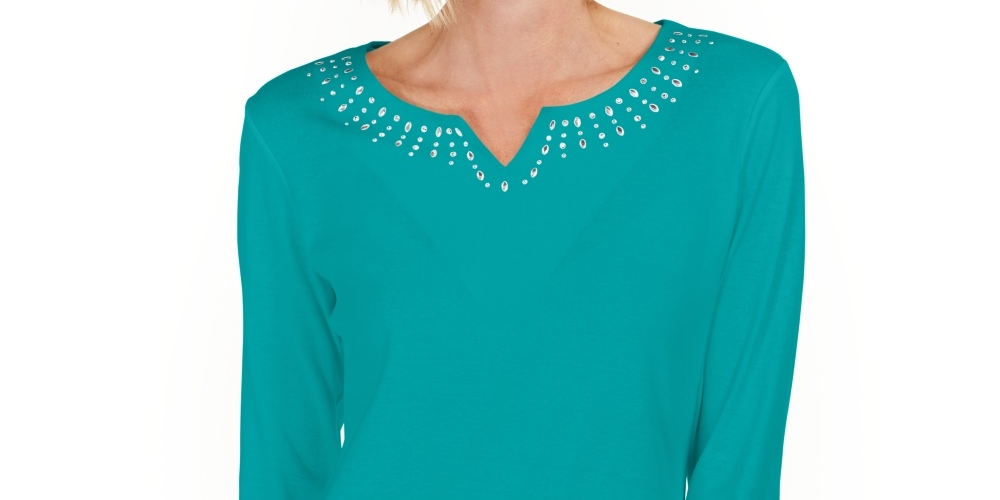 Karen Scott Blusa Feminina de Algodão com Tachas e Gola Dividida Azul Tamanho Médio
