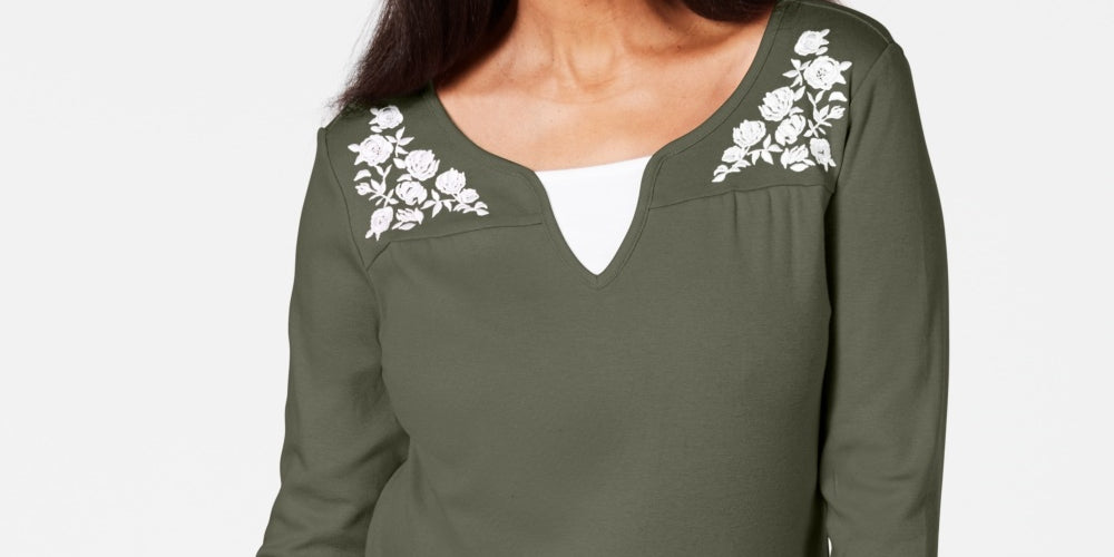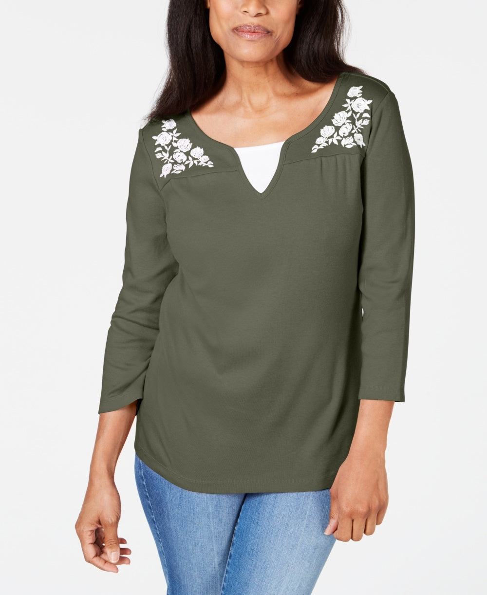 Ajuste relaxado; comprimento no quadril; comprimento aproximado de 26 | Devido ao tamanho generoso; sugerimos um tamanho menor para um ajuste perfeito | Decote redondo com fenda e detalhe contrastante | Bordado floral na pala frontal; bainha arredondada | Mangas 3/4