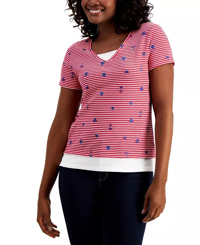 Ajuste relaxado | Projetado para se ajustar e valorizar pessoas de 1,62 m ou menos | Decote TK | Design em camadas; estampa de marinheiro | Algodão/poliéster