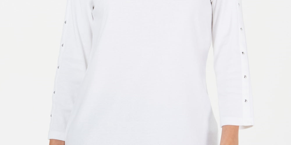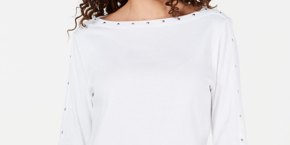 Karen Scott Top feminino de algodão com decote canoa e tachas, tamanho PL, branco