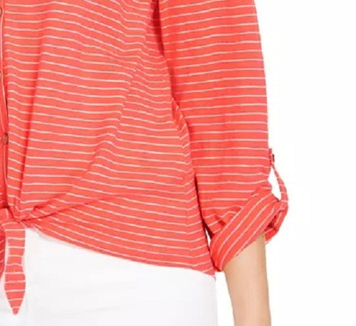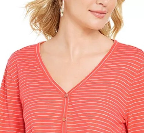 Ajuste relaxado; comprimento aproximado: 22-1/2" | Devido ao tamanho generoso, sugerimos um tamanho menor para um ajuste perfeito | Decote em V; fechos frontais com botões | Listrado; detalhe de amarração frontal | Mangas 3/4 com aba dobrada | Sem forro
