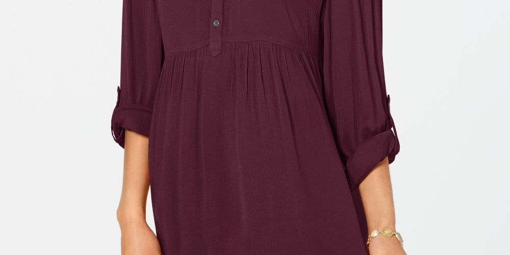 Ajuste relaxado; abaixo do quadril; aprox. 30 de comprimento | Projetado para se ajustar e valorizar a estrutura de 1,62 m ou menos | Gola pontuda; fechos de botão frontal | Costura estilo babydoll | Mangas com abas dobradas