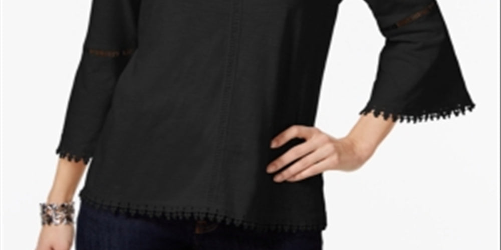 Blusa feminina estilo & co com manga sino e acabamento em crochê, preta, tamanho pequeno P