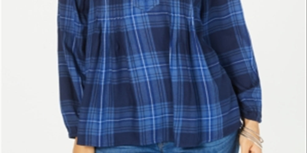 Blusa plissada xadrez feminina Style & Co, azul, tamanho pequeno grande