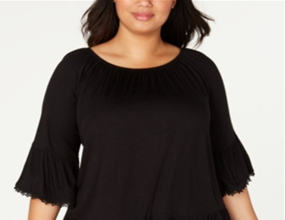 Mangas sino + bainha com babados = flare sobre flare. A sensação divertida e sedutora desta blusa plus size da Style & Co confere ao seu look um toque lúdico instantâneo. | Caimento relaxado; caimento justo nos quadris | Decote redondo | Bainha com babados | Mangas 3/4; punhos com babados |