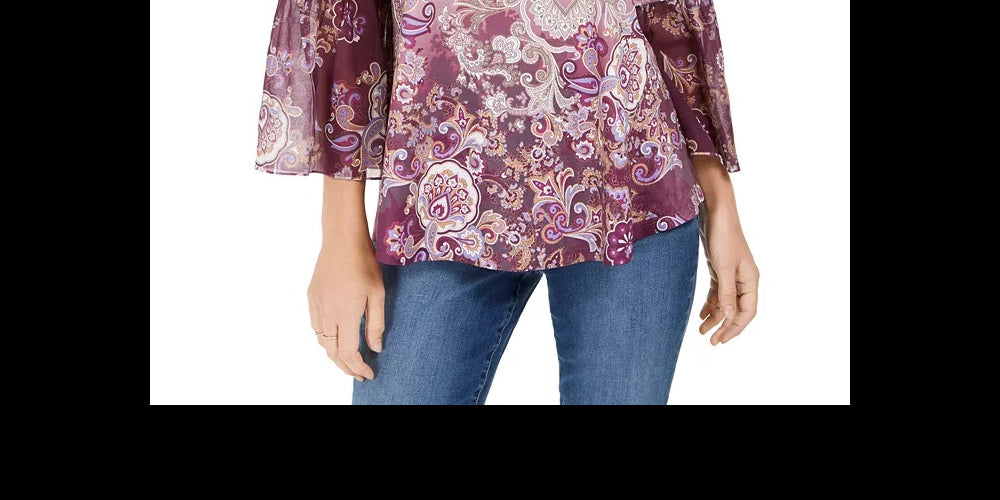 Aproximadamente 27 de comprimento do centro das costas até a bainha | Decote redondo | Mangas sino 3/4 | Poliéster/elastano