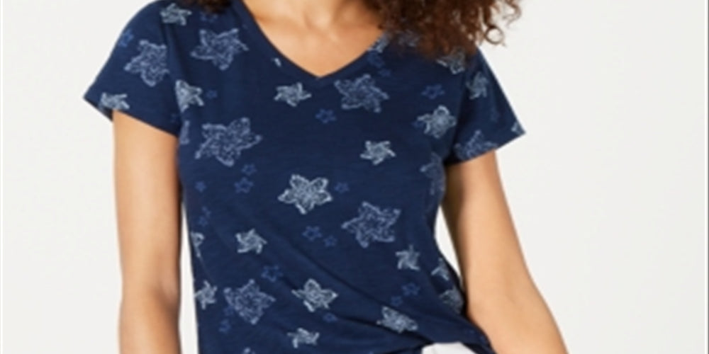 Camiseta feminina estampada com decote em V, azul, tamanho pequeno G