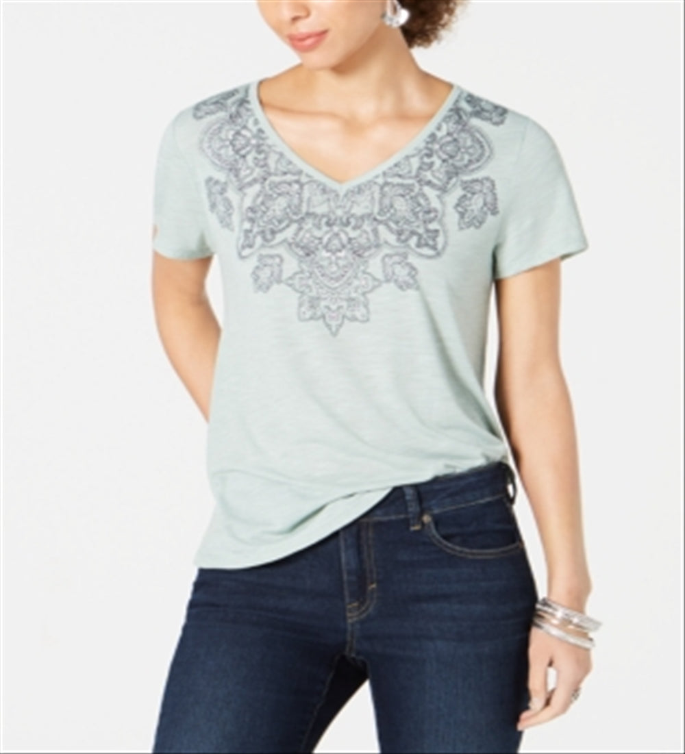 Camiseta feminina estampada com decote em V, tamanho P, verde, estilo & co