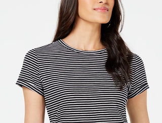 Camiseta feminina listrada Maison Jules com gola redonda, preta, tamanho XS