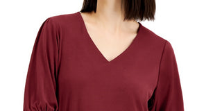 JM Collection Blusa feminina com manga bufante e decote em V, vinho, tamanho pequeno