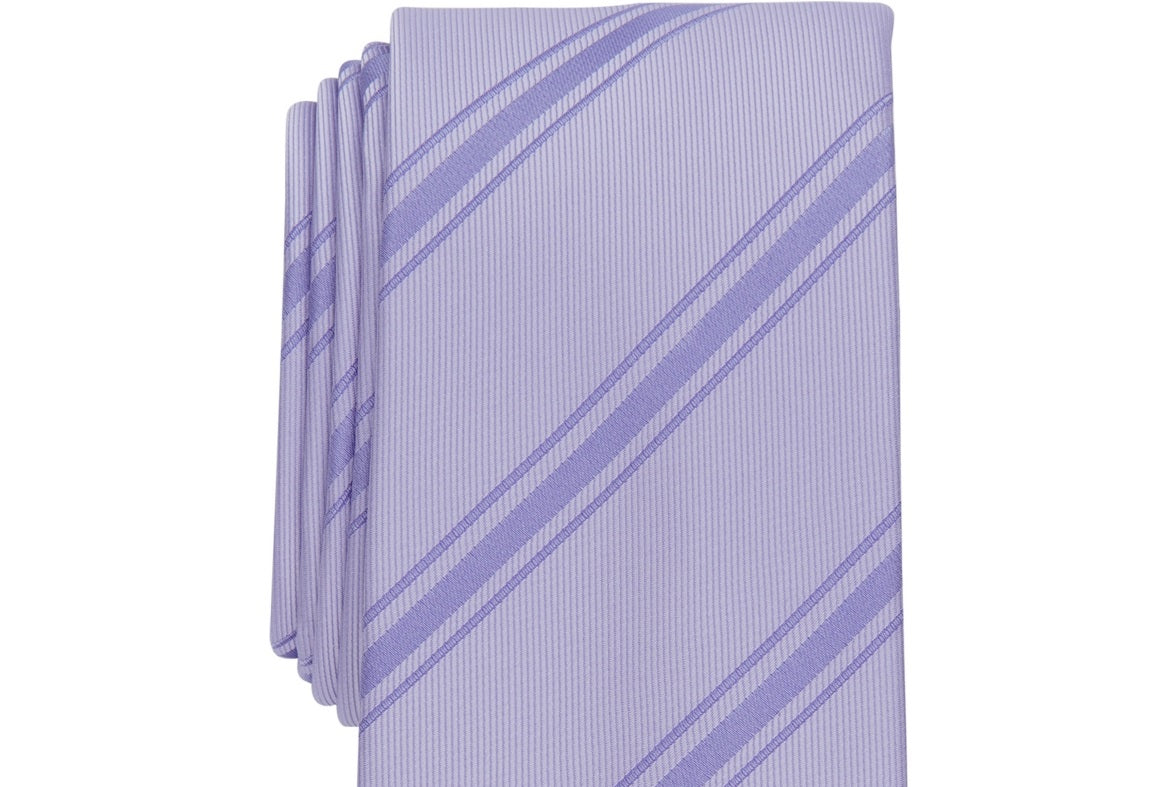 Crie um visual moderno e elegante sem esforço com o design listrado simples em tons neutros e o perfil fino da gravata Trinity da Alfani. | Design fino | 2-3/4 de largura | Padrão listrado | | Poliéster | Lavagem a seco
