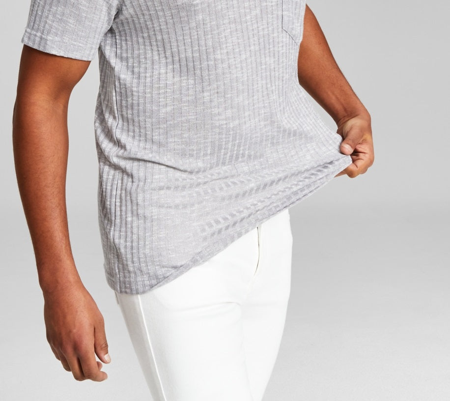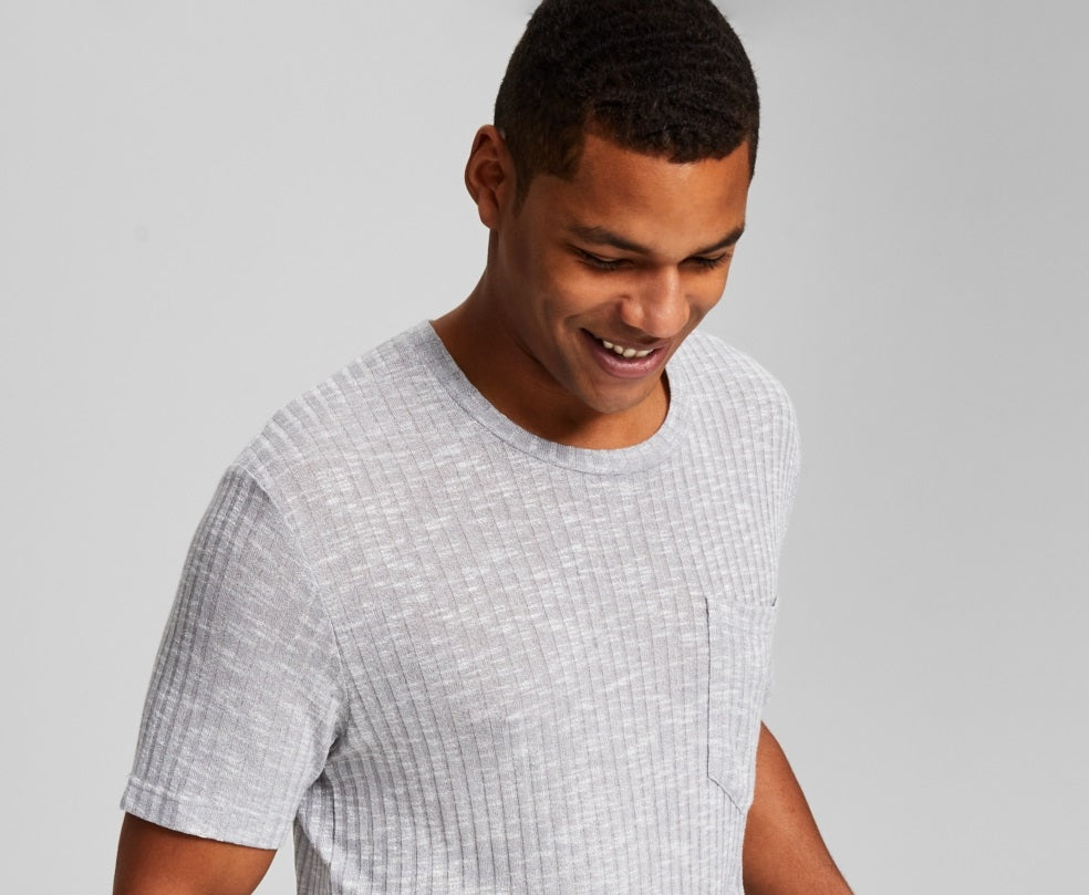 E agora isso apresenta um visual mais refinado para uso casual com o corpo canelado desta linda camiseta. | Caimento regular | Gola redonda | Mangas curtas | Bolso no peito esquerdo; corpo canelado; malha mesclada | Viscose | poliéster