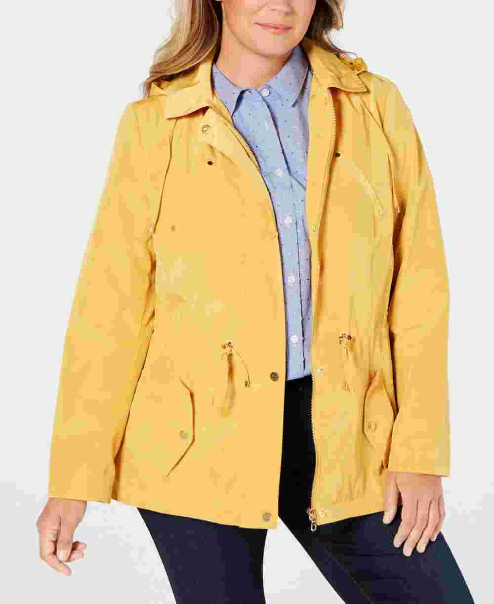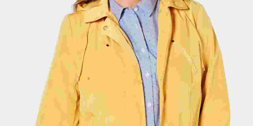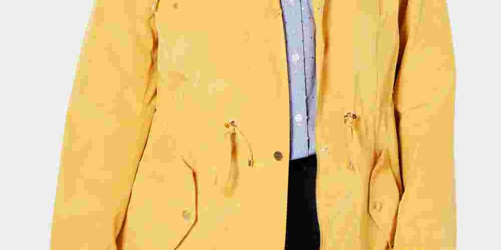 Capuz com cordão | Fechos de botão na frente | Dois bolsos na frente | Ferragens douradas; cós com cordão | Resistente à água para ajudar a resistir à tempestade | Forro estampado