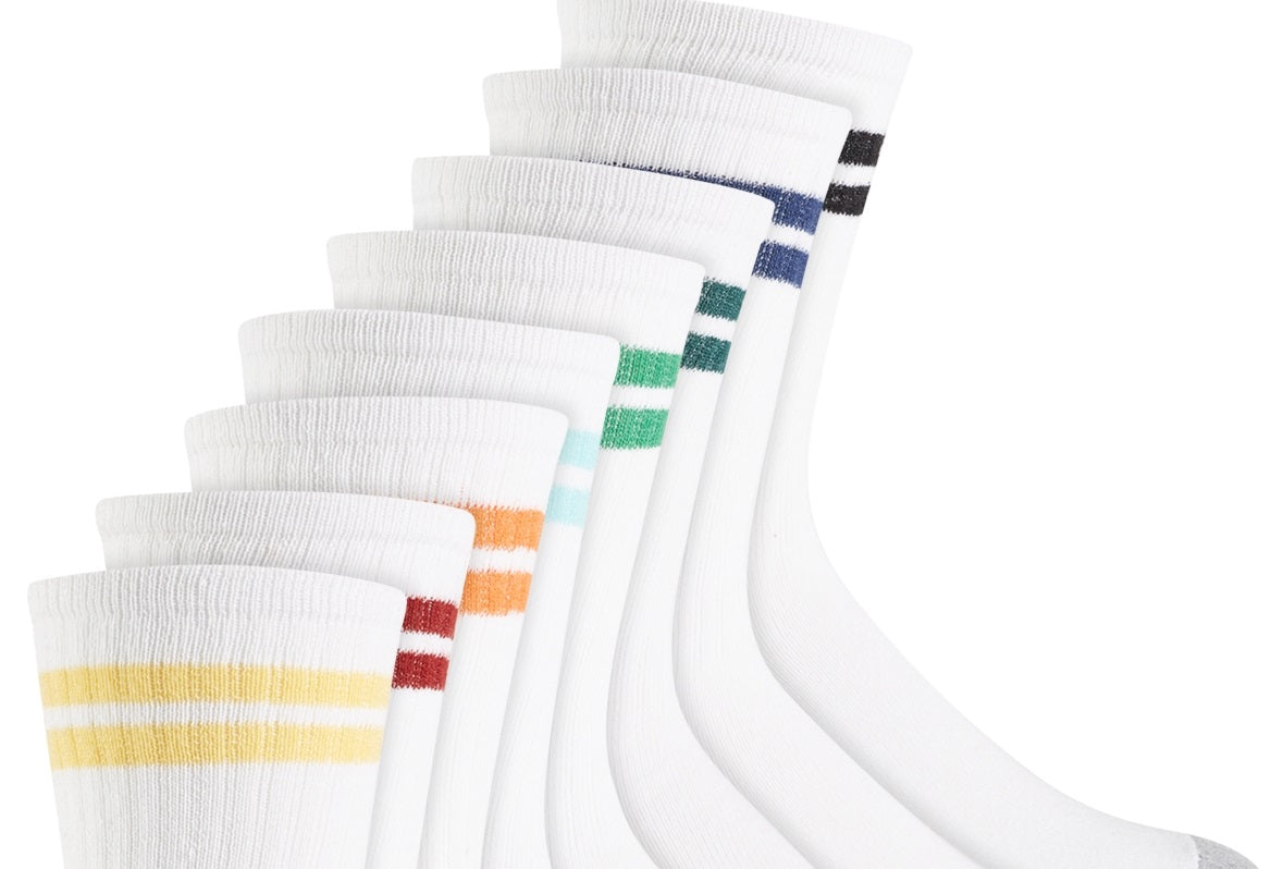 Dê um toque esportivo aos seus itens básicos com as listras atléticas que dão estilo a estas meias cano alto incrivelmente confortáveis da Club Room. | Pacote com oito pares de meias canoas | Comprimento cano alto | Punhos canelados | Listras duplas na parte superior da perna | Meio acolchoado |