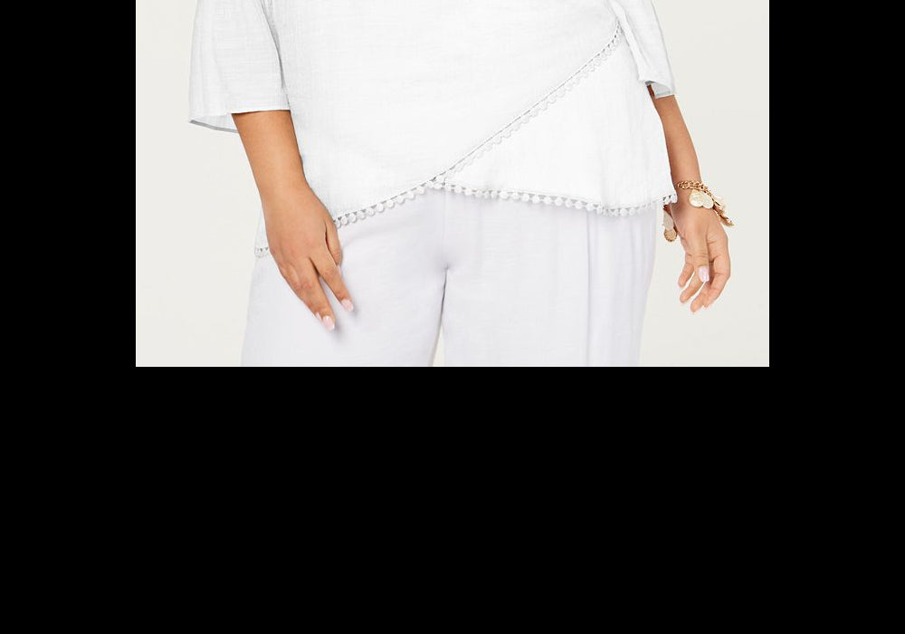 A vida pode ser uma praia com o top plus size arejado com acabamento em crochê da JM Collection | com um estilo cruzado atraente e um colar de corrente removível que adiciona um toque sofisticado. | Caimento relaxado; comprimento no quadril | Decote redondo com colar de corrente removível | Pala traseira plissada; acabamento em crochê na bainha frontal cruzada | Mangas 3/4 com punhos em formato de sino com acabamento em crochê
