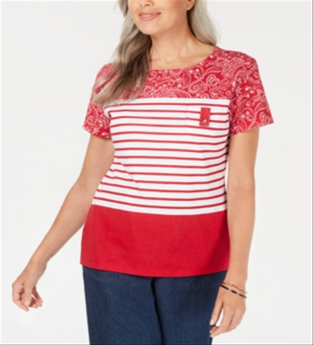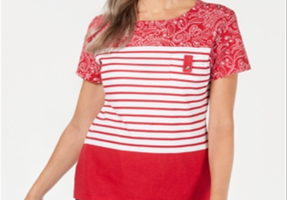 Botões decorativos dão um toque diferente a esta blusa Karen Scott com decote redondo em uma mistura de estampas clássicas. | Acabamento no quadril | Devido ao tamanho generoso | sugerimos um tamanho menor para um ajuste perfeito | Decote redondo | | Algodão/poliéster