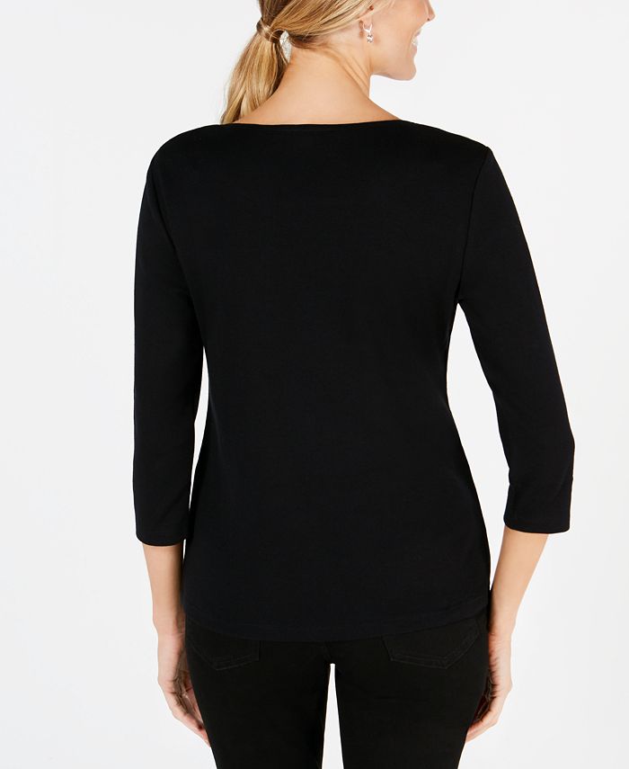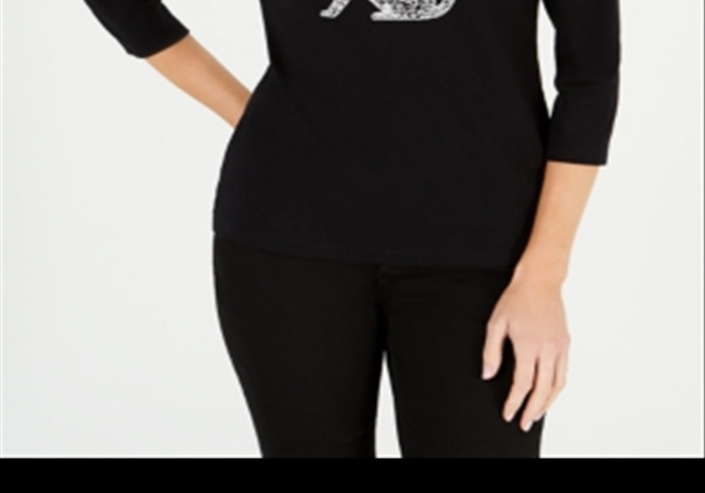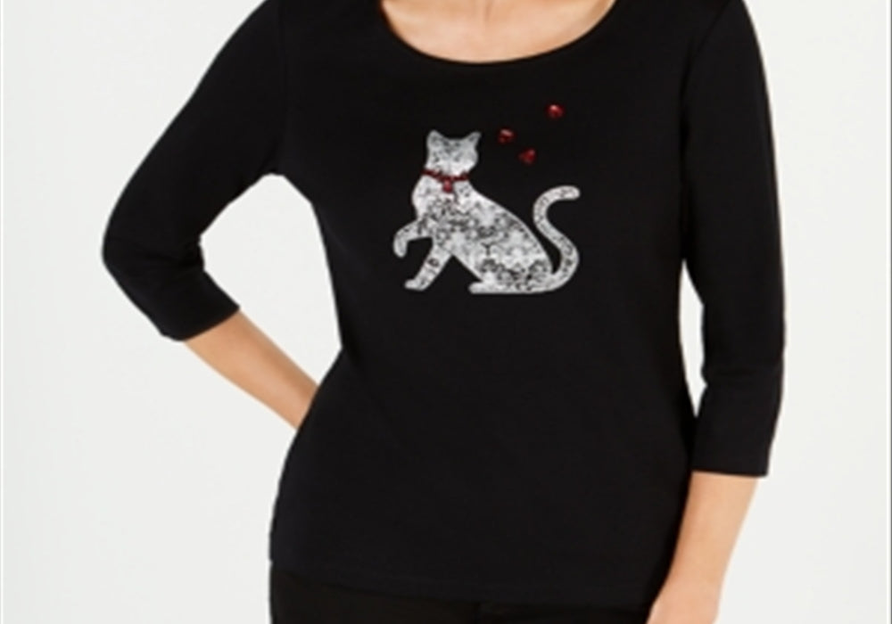 Uma adorável estampa de gato adiciona um toque de personalidade a esta camiseta de algodão com manga 3/4 da Karen Scott. | Acabamento no quadril; aprox. 27 de comprimento | Devido ao tamanho generoso | sugerimos um tamanho menor para um ajuste perfeito | Decote redondo | Estampa de gato na frente com strass