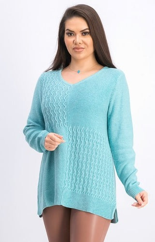 Ajuste relaxado; comprimento no quadril; aprox. 71 cm de comprimento | Devido ao tamanho generoso, sugerimos um tamanho menor para um ajuste perfeito | Decote em V | Blocos de pontos de malha mistos na frente; barra canelada com aberturas laterais | Mangas compridas com punhos canelados