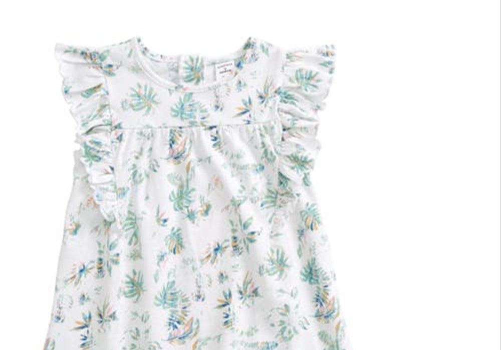 Estampa tropical branca e verde | Detalhes de babados | Tamanho 9M | Inclui conjunto de vestido | Vendido na Nordstrom | Caimento confortável | Tecido de alta qualidade | Fácil de limpar | Versátil para ocasiões especiais | Design elegante