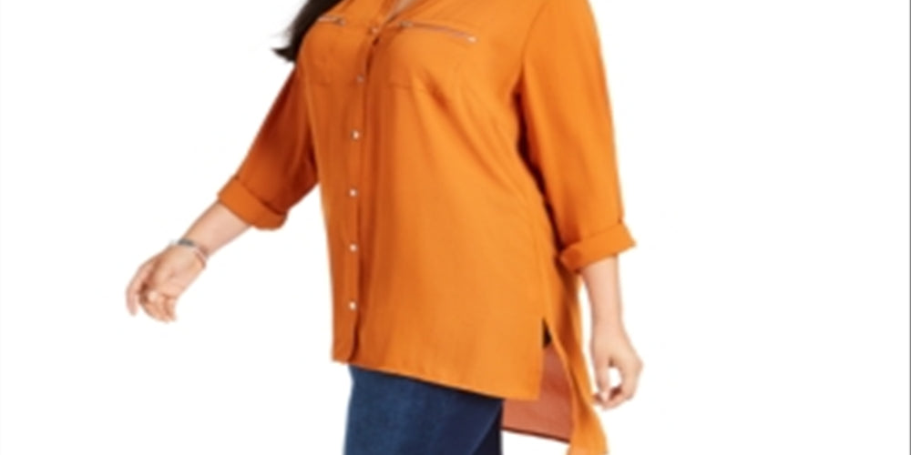 Bolsos com zíper dão um toque especial a esta blusa plus size com toque fresco e bainha alta e baixa da NY Collection. | Decote em Y com gola mandarim; fechamento frontal por botões | Bolsos de aplicação com zíper no peito; bainha alta e baixa com fendas laterais | Mangas compridas que se transformam em mangas 3/4 com aba dobrada | Poliéster | Lavável à máquina | Importado