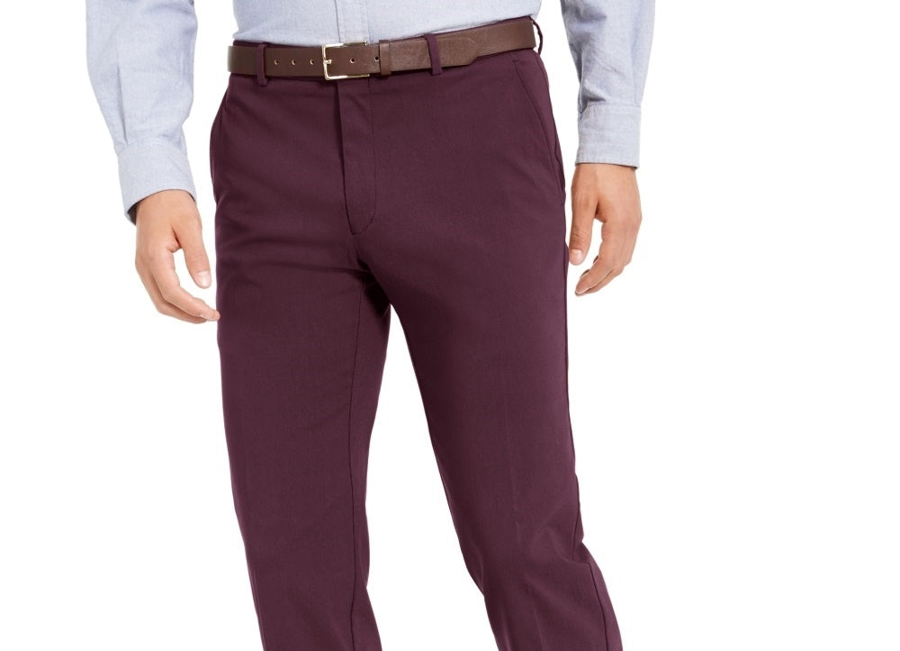 Calças de corte moderno assentam na cintura; ajuste perfeito nos quadris e coxas com uma abertura nas pernas ligeiramente afunilada | Frente plana; Bainha acabada; Sem punho | Braguilha com zíper e fecho de botão e gancho; Passadores de cinto | Dois bolsos frontais tipo 1/4; Dois bolsos duplos traseiros tipo vassoura com fecho de botão | Sem forro; Vincado; TH Flex - Feito sob medida para se mover com tecido elástico, cós superelástico, lavável à máquina e resistente a rugas | Rayon/nylon/elastano