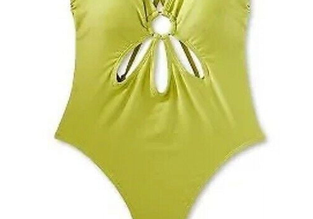 Design frontal recortado | Cor verde vibrante | Macio | Material elástico | Tecido de secagem rápida | Alças ajustáveis ​​| Tamanho XS | Detalhe frontal estiloso com argola | Ideal para natação | Marca Wild Fable | Design de peça única