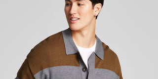 E agora este suéter masculino de gola redonda com blocos de cores cinza, tamanho médio