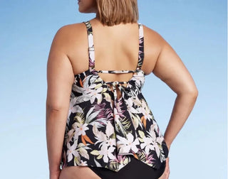 Top tankini feminino Kona Sol com decote em V profundo e alças nas costas, estampa floral preta, tamanho 3X