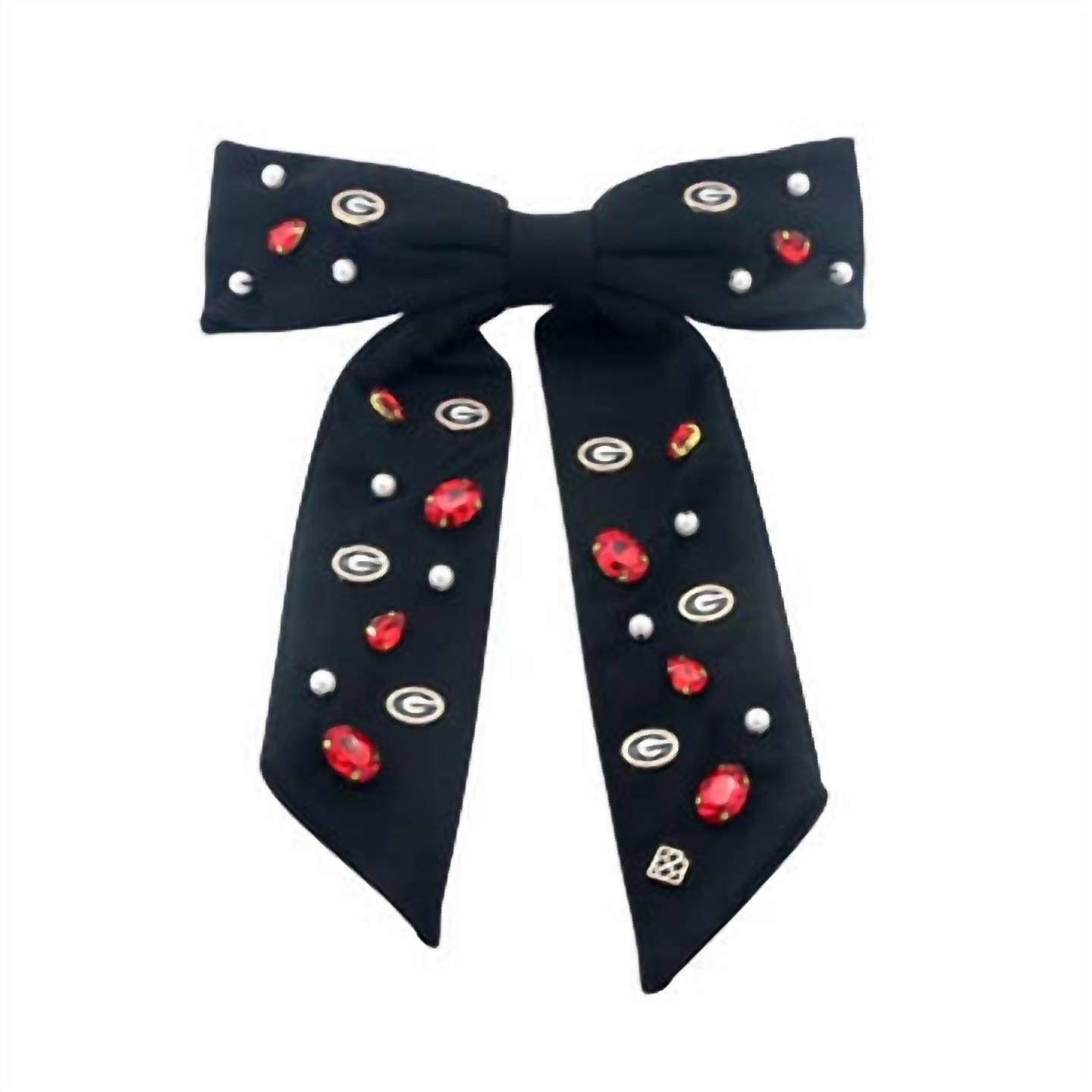 Introducing the Georgia Bow Barrette by Brianna Cannon, an officially licensed collegiate product designed for the ultimate University of Georgia fan. This black bow barrette is adorned with gold plated logo charms and features hand-sewn resin pearls and crystals for a touch of elegance. Perfect for everyday wear, it combines comfort and university pride seamlessly.