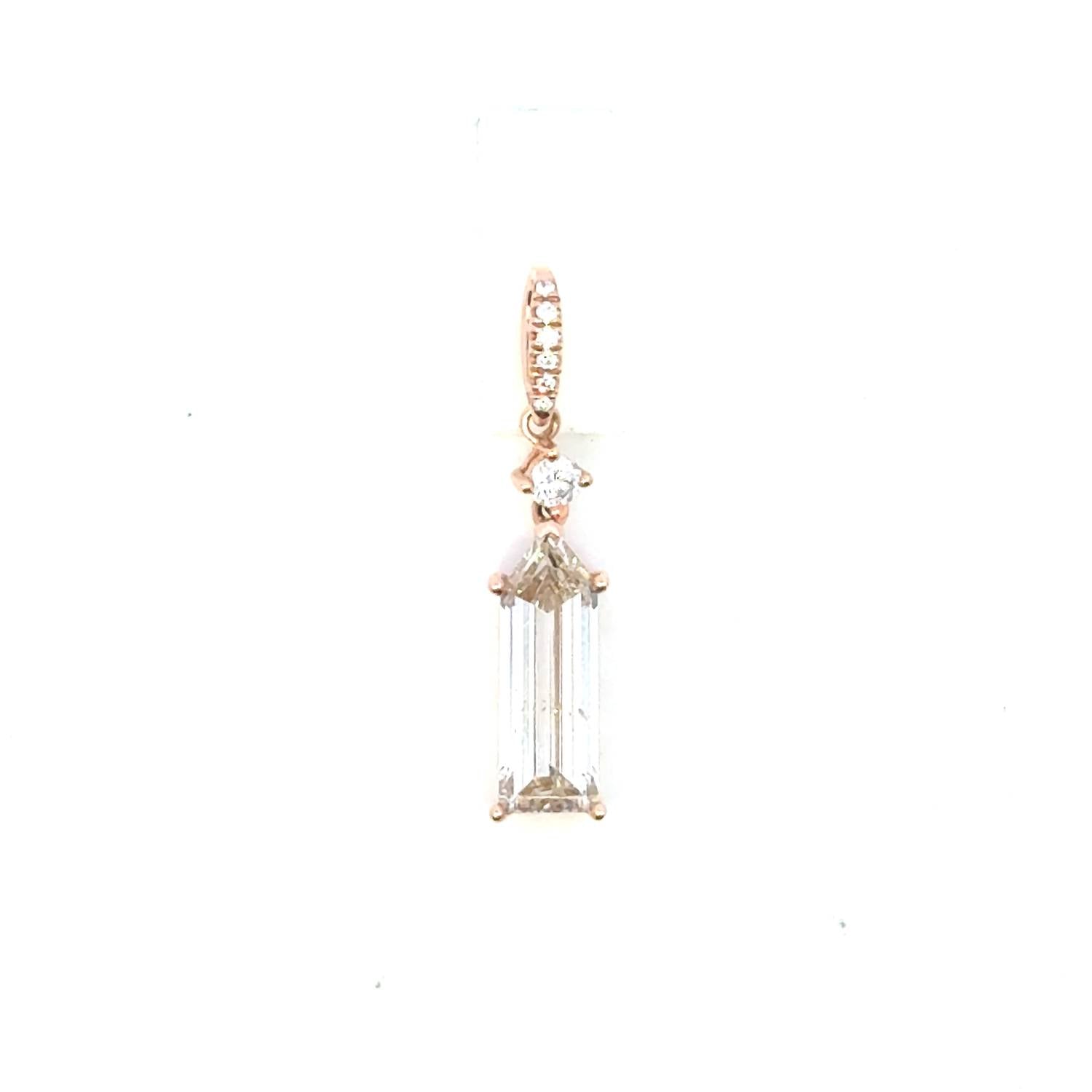 Stunning drop pendant featuring 1.31 carats of natural diamonds with an elegant emerald-cut main stone. Crafted in 14k rose gold (0.60 grams) with round brilliant accent and sparkling pavé diamonds along the bail. Classic prong settings maximize brilliance while the warm rose gold beautifully contrasts the sparkling diamonds. This timeless piece offers versatility and luxury, perfect for everyday elegance or special occasions. Key Features: 1.31 total carat weight natural diamonds. Emerald cut main stone with round brilliant accent and pavé details. 14k rose gold construction (0.60 grams). Classic prong setting. Drop/dangle pendant design. Perfect for layering or wearing alone.
