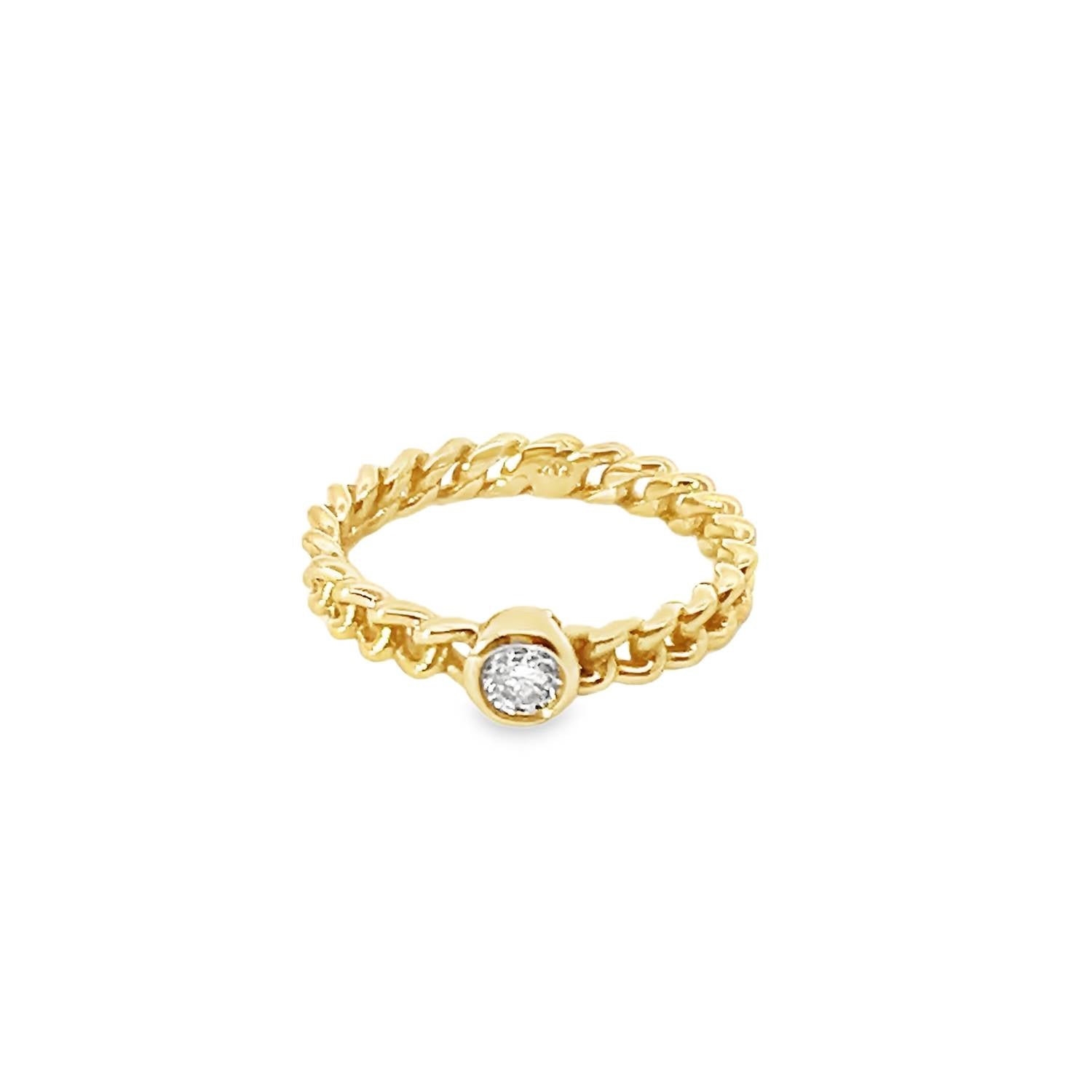 Wear this ring stacked or by itself... you can't go wrong. Presenting the Women's Solitaire Round Diamond Chain Ring by GEMMA COUTURE, a stunning piece crafted from 14k yellow gold and adorned with a natural 0.20tw round brilliant diamond. This fine ring features a structured chain band with a bezel setting that ensures both elegance and stability. Size: 6.5. Stone Color: G.
