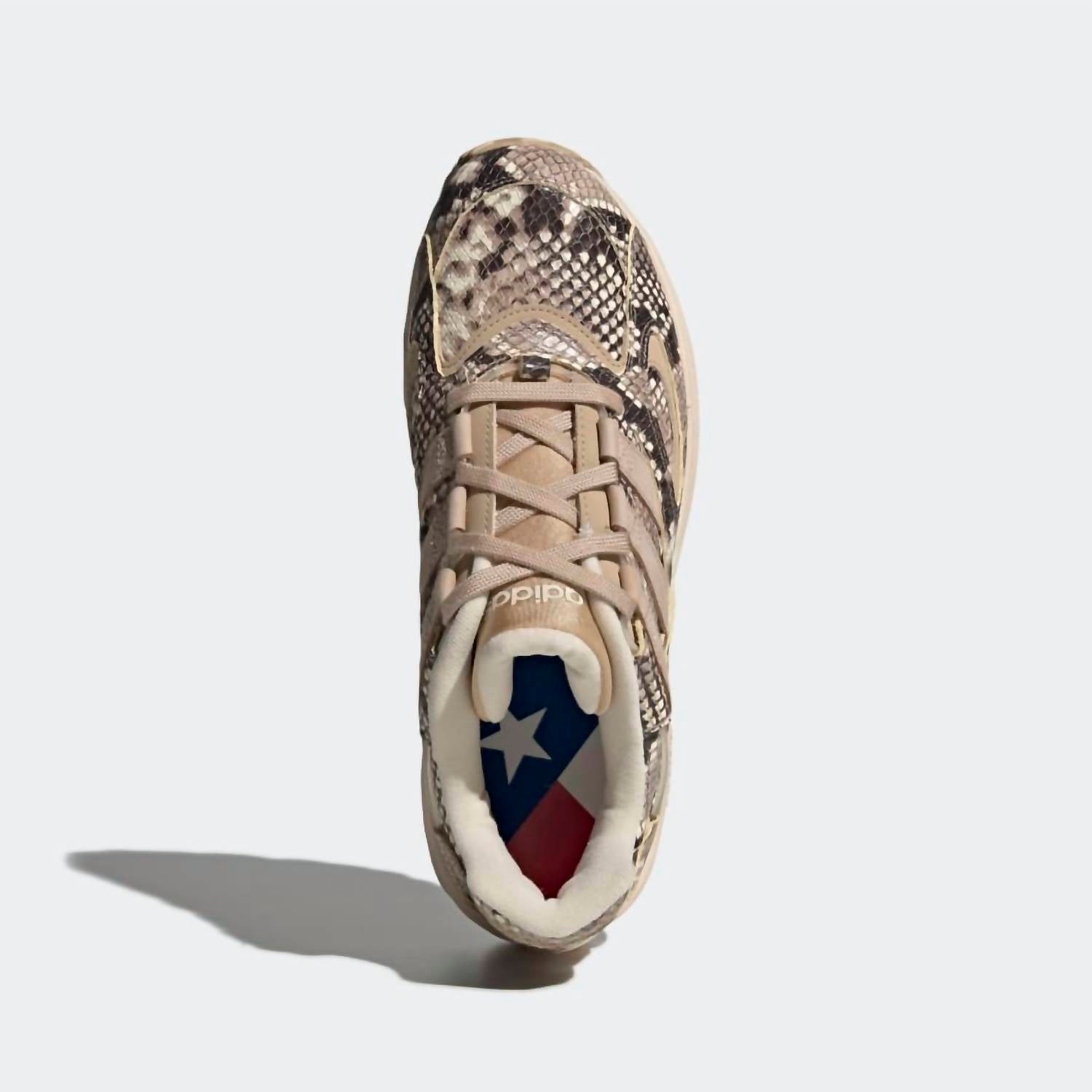 Fecho de cadarço com pontas metálicas. Cabedal em couro com estampa de pele de cobra e relevo. Forro em couro. Solado de borracha. Amortecimento Adiprene. Palmilha estampada.