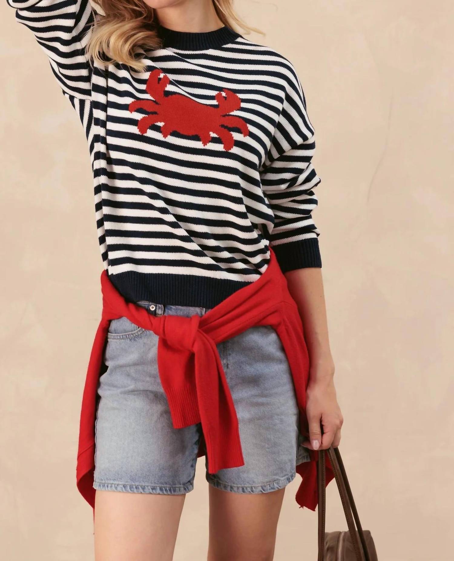 Experience the perfect blend of comfort and style with this trendy crew neck sweater, designed to effortlessly elevate your wardrobe. Pair it with your favorite denim and loafers for the perfect look. Introducing the Sonja Sweater by 27 Miles Malibu, a timeless nautical-inspired piece perfect for your winter vacation. This cotton sweater features long sleeves and a playful red crab graphic that adds a touch of coastal charm. Designed with a crew neckline and a stripe pattern in cloud and navy, this sweater offers a relaxed fit for unrivaled comfort. Closure is pull-on style, and for care, simply hand wash and lay flat to dry.