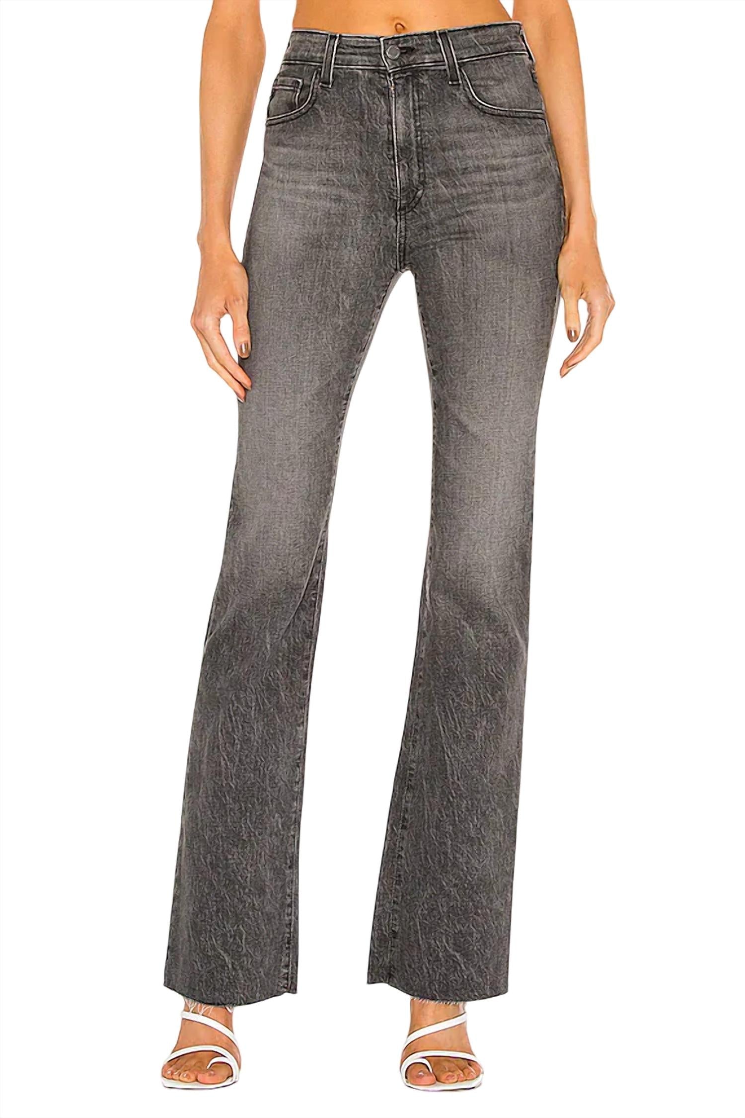 Just add boots! Features a zip fly with button closure and 5-pocket design. Light whiskering and fading with a frayed hem. 33" Inseam. 10.5" Rise. 13" Knee opening. 17" Leg opening. Machine wash cold. 92% Cotton, 6% Polyester, 2% Elastane.