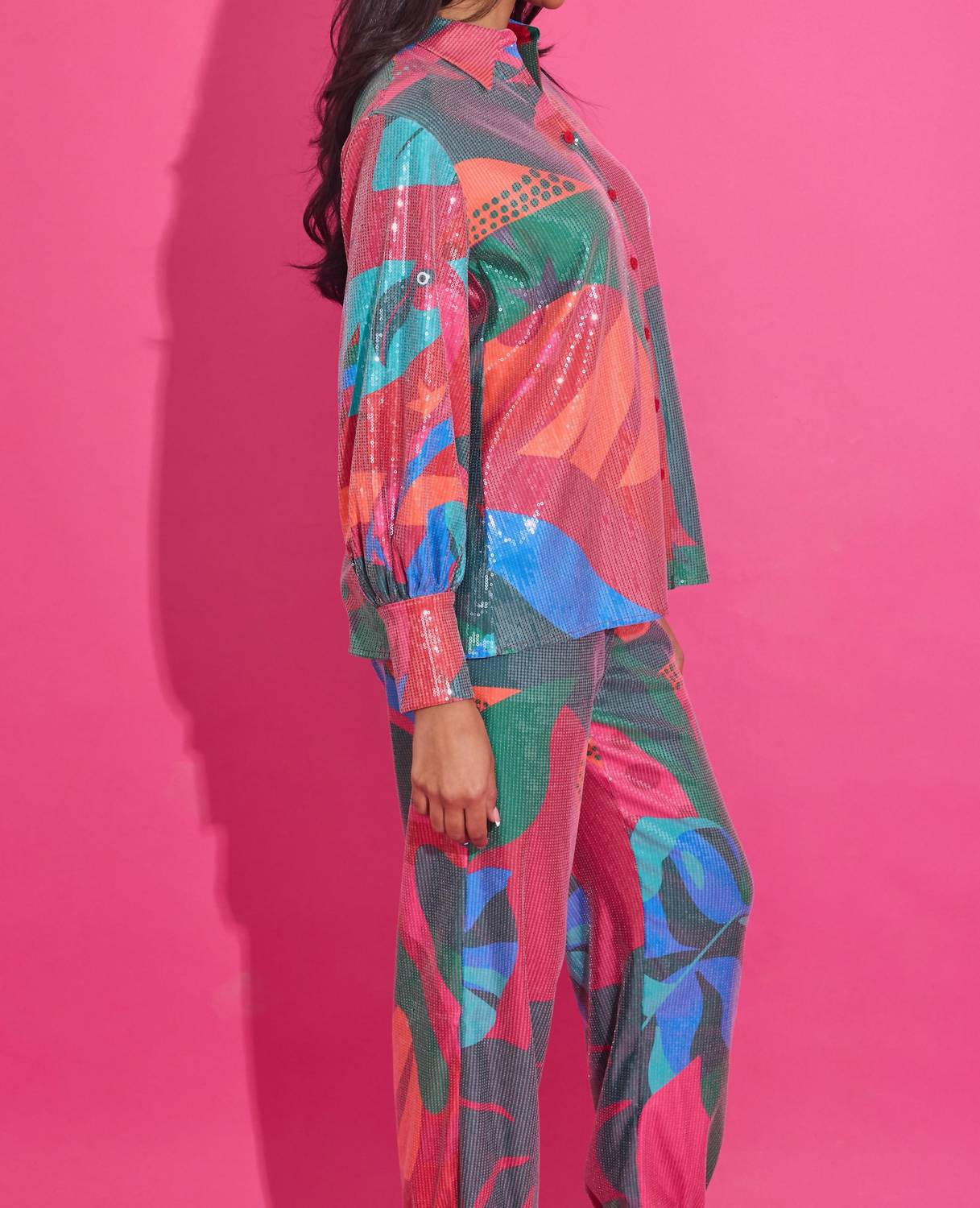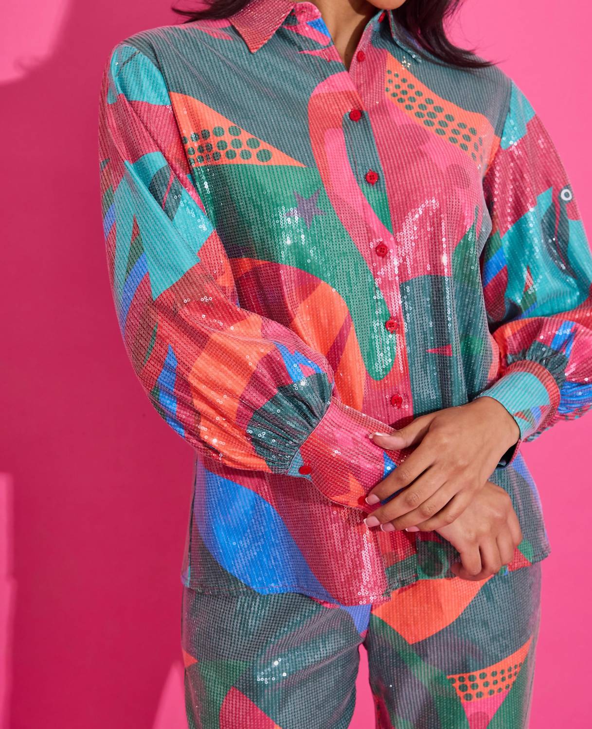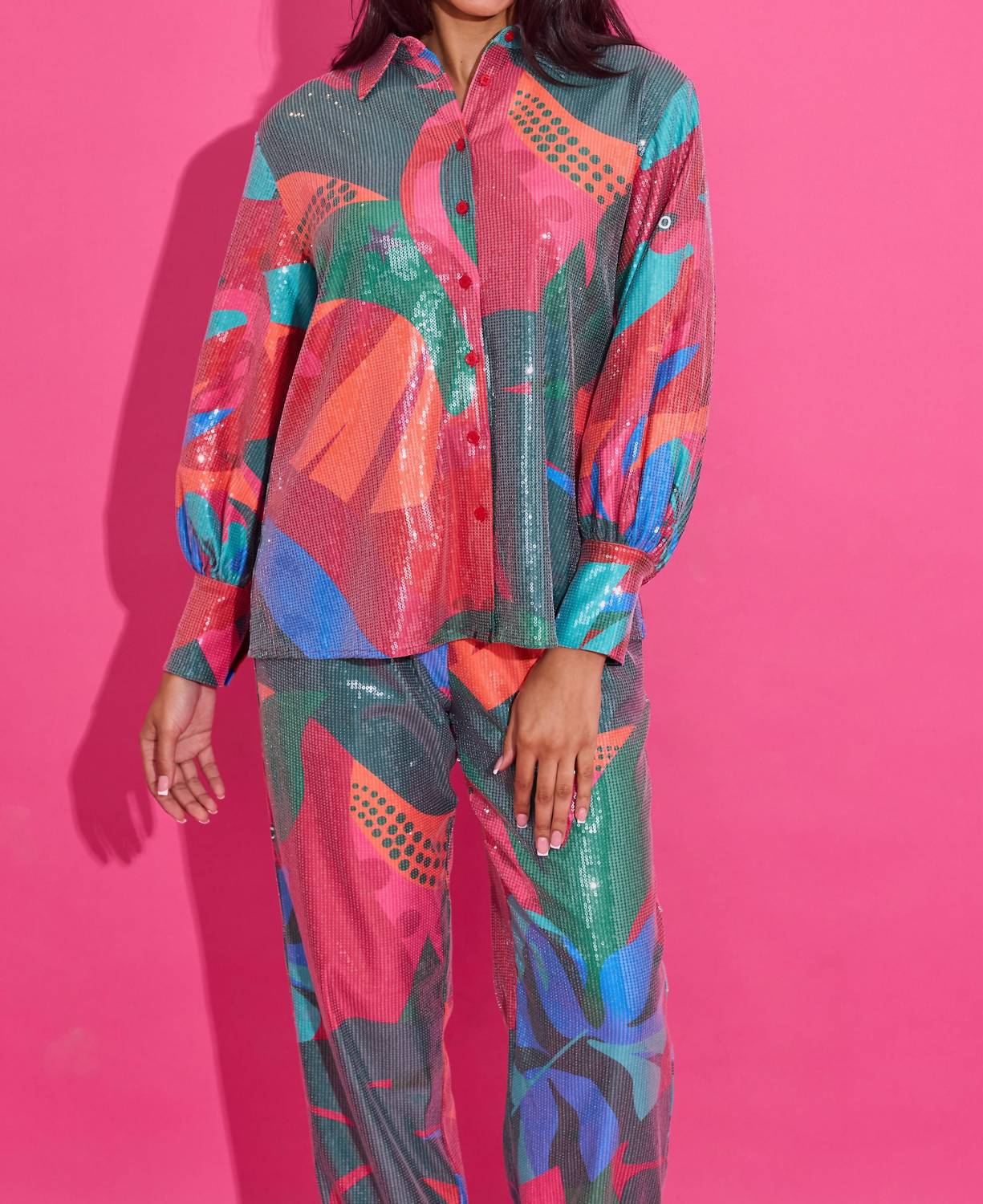 A versatile blouse that works from desk to dinner! Elevate your wardrobe with the Sadie Long Sleeve Top by Alden Adair, a stylish addition in vibrant Tropical Jingle perfect for any holiday party. This women's patterned blouse features a delicate scalloped trim on the long sleeves, pocket, and collar, adding a feminine touch to its chic design. Made from 95% Polyester and 5% Spandex with a 100% Polyester lining, it's crafted in China with a convenient button closure. Care instructions: Hand wash and line dry.