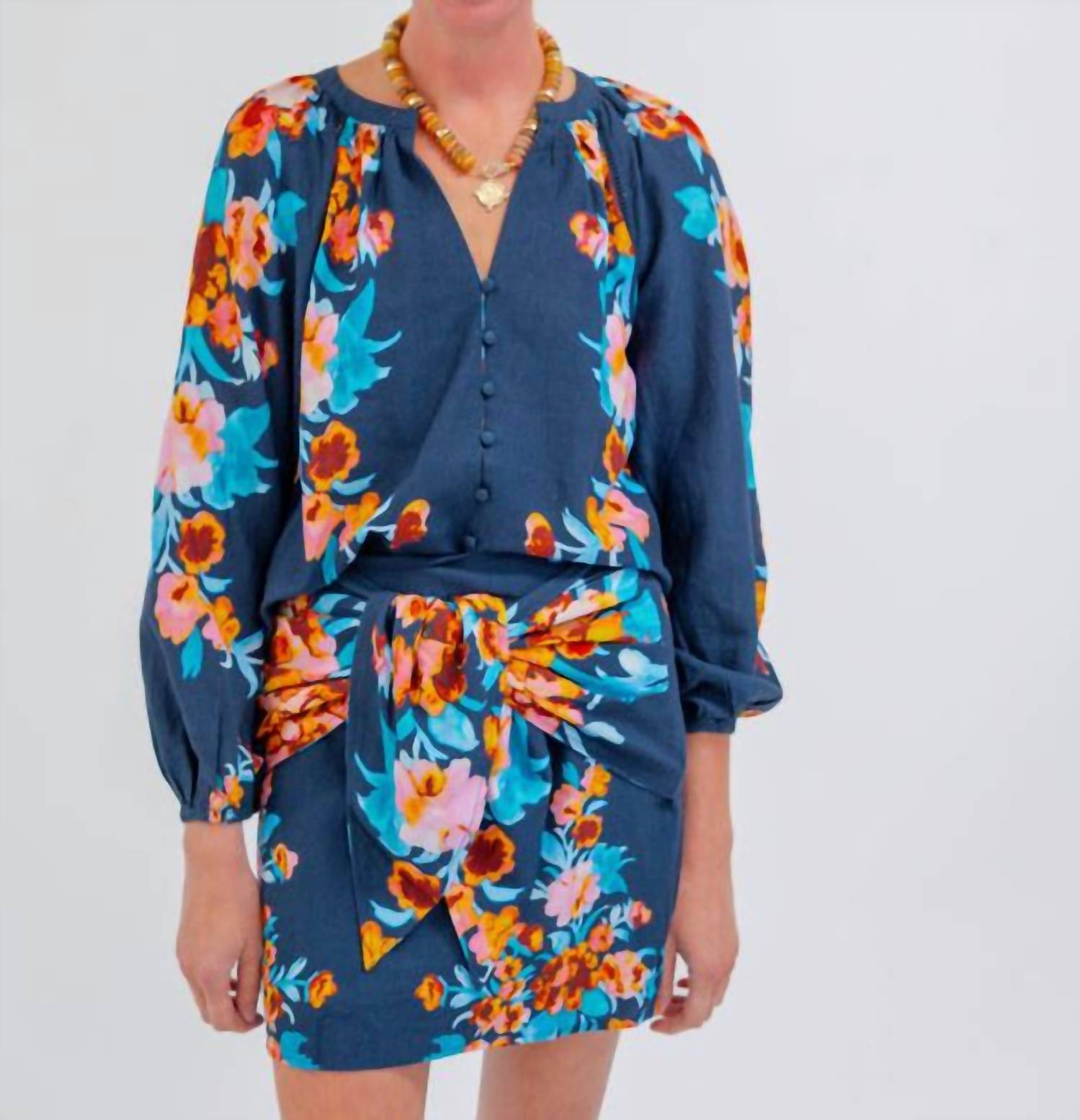 Elevate your summer wardrobe with the Janis Mini Skirt by ALLISON NEW YORK, featuring a charming navy floral pattern. Designed with a flattering mini length, this skirt is crafted from a comfortable 55% Viscose and 45% Linen blend. Closure is secured with a tie, ensuring both style and ease of wear. For best care, hand wash and lay flat to dry.