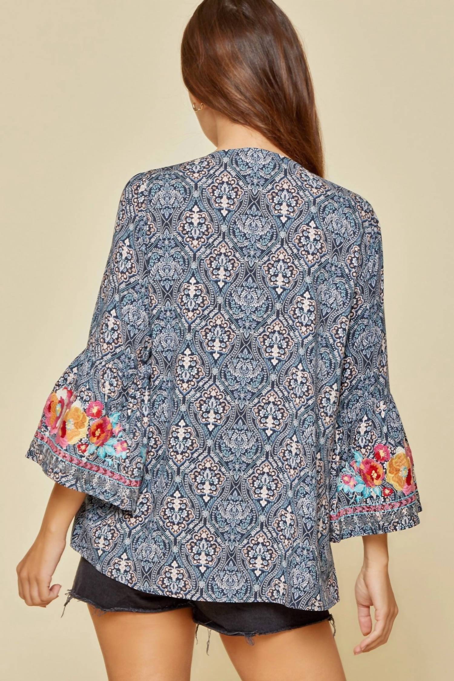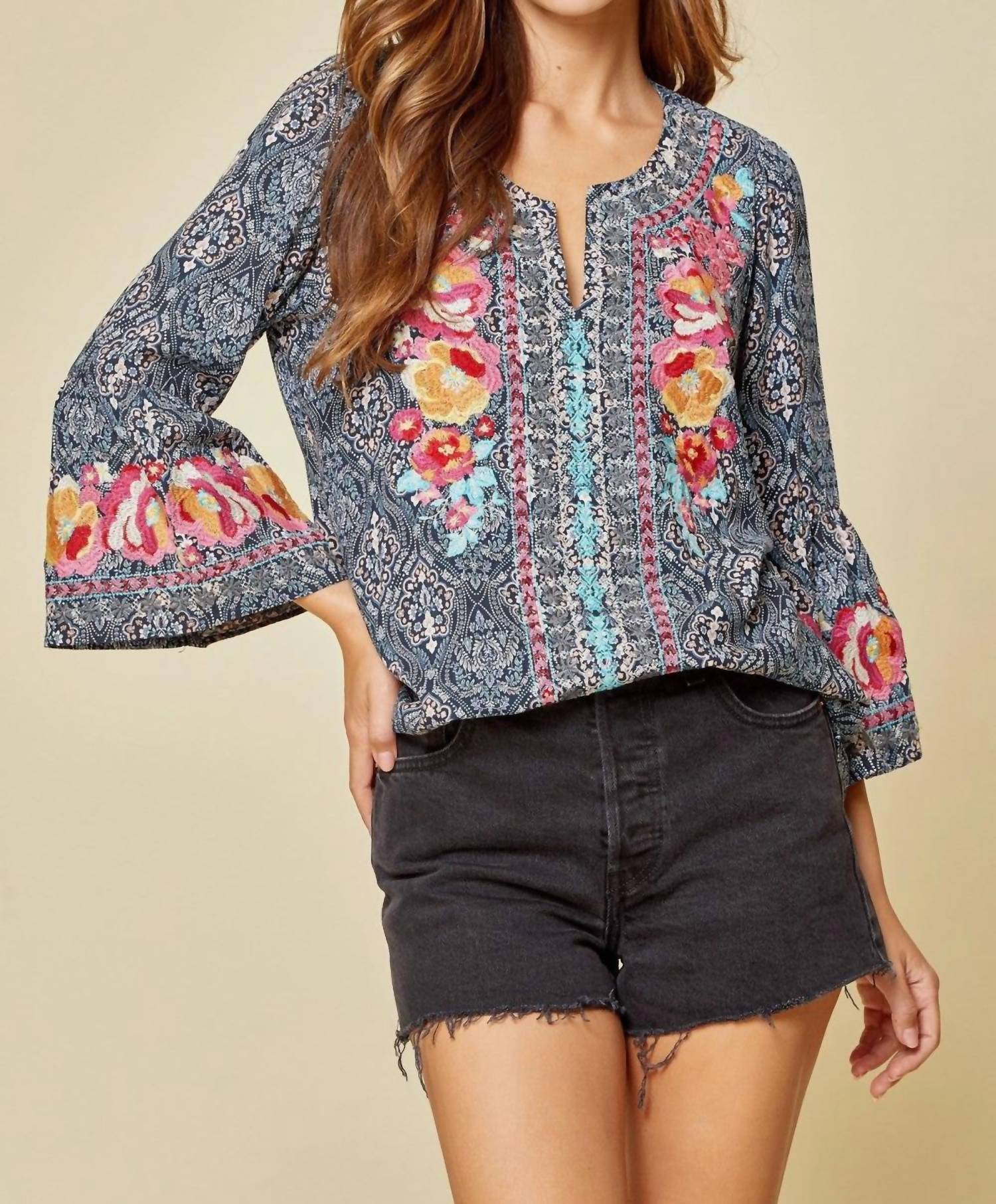 Pair this with your favorite jeans and slides for your next girls night out. Introducing the South Beach Embroidered Top by ANDREE BY UNIT, a standout piece in vibrant navy that exudes Boho Chic style. This lovely top boasts long bell sleeves and a split V-neckline adorned with colorful embroidery on a beautiful print. Crafted from 100% woven rayon, the fabric offers no stretch for a relaxed, A-line fit. Closure: Pull-on style. Care: Hand wash cold. Available in sizes from Small (Bust 40", Length 27") to 3X (Bust 54", Length 29").
