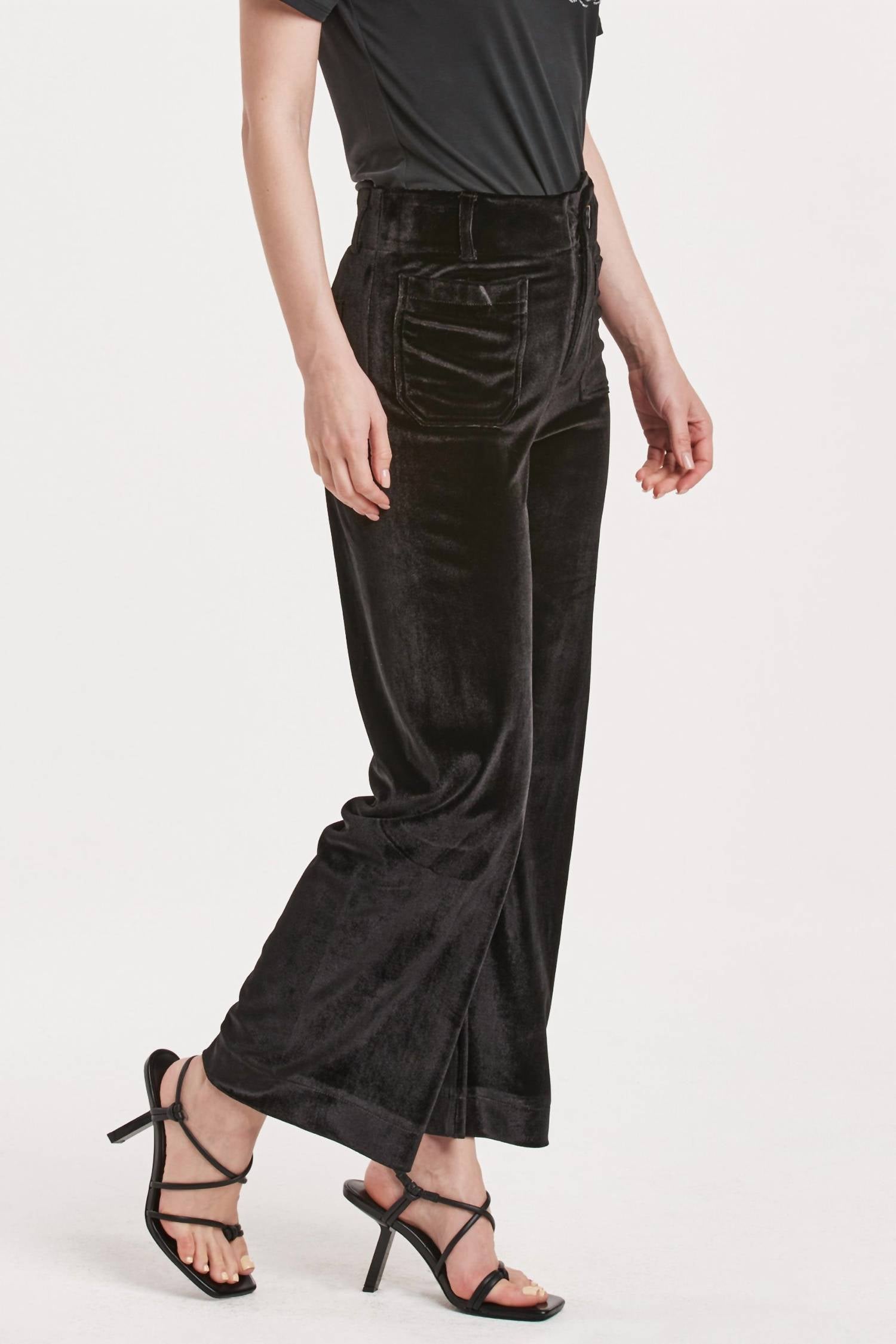 Introducing the Anahi Velvet Flare Leg Cropped Pants by Another Love, a polished yet comfortable addition to your wardrobe. Crafted in a blend of 90% Polyester and 10% Spandex, these pants feature a high rise with an 11.75" front rise, a 26" inseam, and a stylish 20.75" leg opening. Closure comes courtesy of a sleek button, and practical patch pockets add functionality. Care for these pants is easy with machine wash instructions, making them ideal for day-to-night transitions.