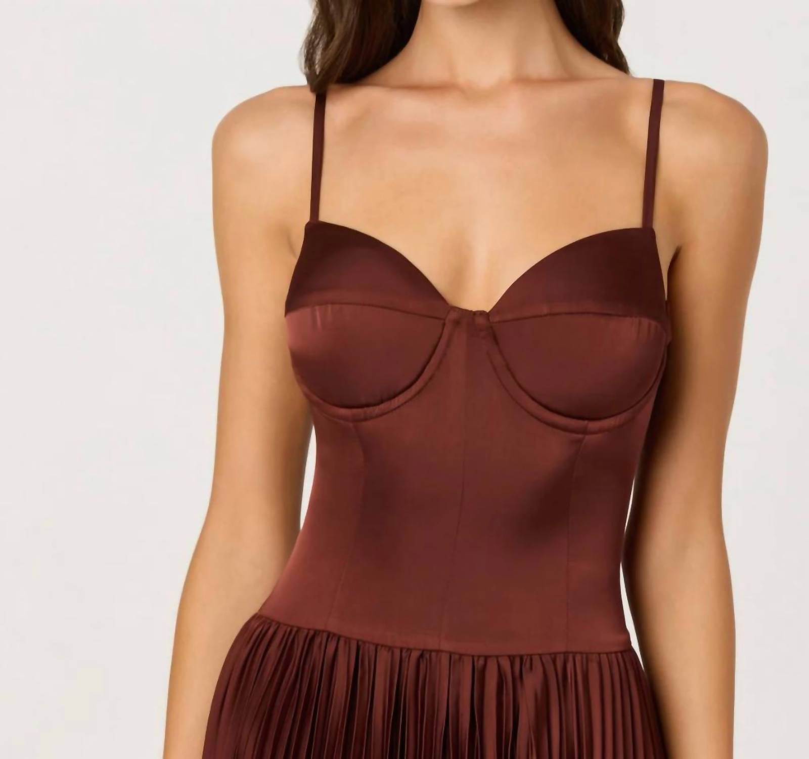 Elevate your wardrobe with the Elyssa Satin Maxi Dress by ASTR, showcased in a chic Rust Brown. Crafted from luxurious polyester, this sleeveless dress features elegant spaghetti straps and a timeless A-line silhouette. The dress is accented with a corset-style bodice and sweetheart neckline, full of sophistication and charm, while the hidden back zip provides a seamless fit. Designed for weddings and summer gatherings, this piece exudes quiet luxury and is best cared for with dry cleaning.