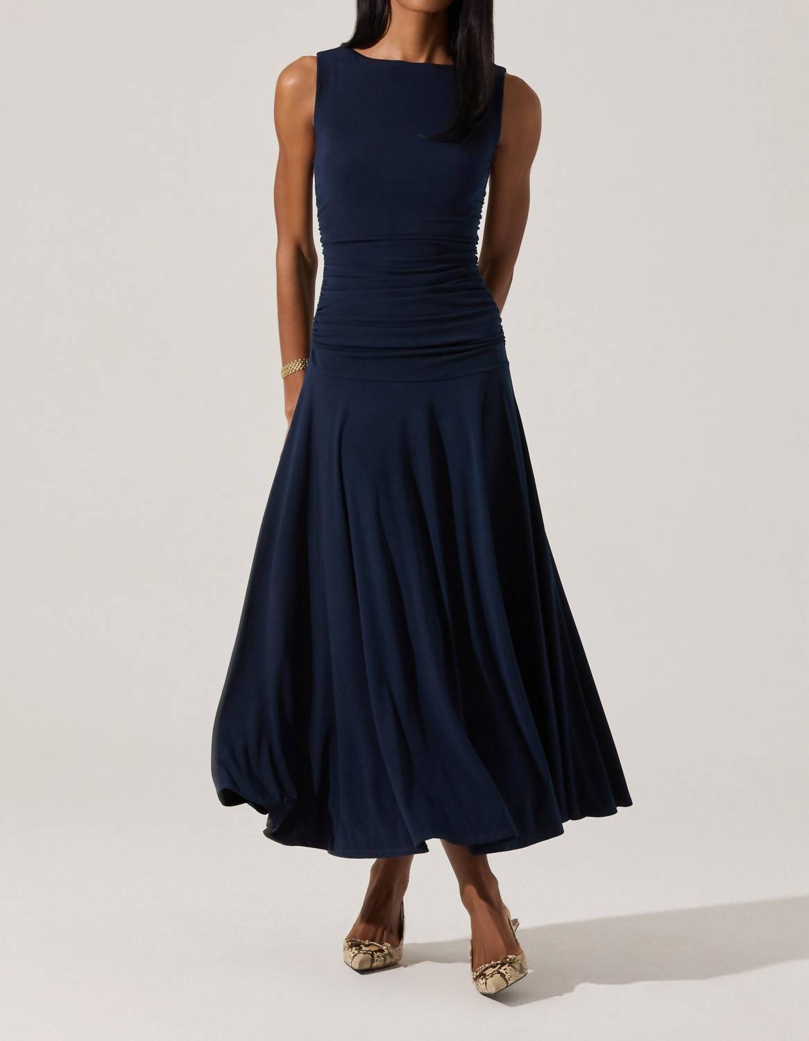 Step into elegance with the Midnight Blue Melisandre Midi Dress by ASTR, a perfect choice for any evening event. This sleeveless dress is crafted from 95% polyester and 5% elastane, offering a flattering A-line silhouette. Designed with a lined bodice and convenient pull-on closure, its ruched sides and drop waist enhance the overall gracefulness. Care: Dry clean only, ensuring this solid pattern dress remains a timeless piece in your wardrobe.