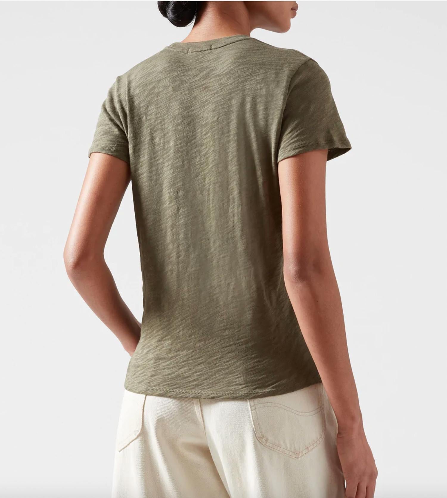 Discover the Schoolboy Slub Jersey Tee by ATM in a striking Army hue, perfect for elevating your casual ensemble. Crafted in a short sleeve design from 100% Peruvian Cotton, this piece features a unique textured fabric that offers a subtly sheer look. The relaxed crew neck and slightly shrunken straight cuts create a flattering silhouette for any woman's wardrobe. Care instructions recommend hand washing in cold water for best maintenance.