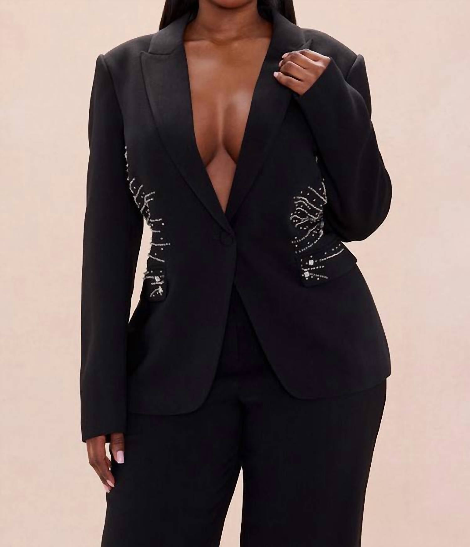 Elevate your black-tie ensemble with the Daphne Stone Jacket by AZI, a blend of sophistication and quiet luxury. Tailored for the modern woman, this black piece features a textured pattern and a chic V-neck, made from comfortable polyester. Its long sleeves and button closure make it a perfect choice for fall festivities and New Year's Eve celebrations. Embrace elegance with this blazer, made with precision and attention to detail.