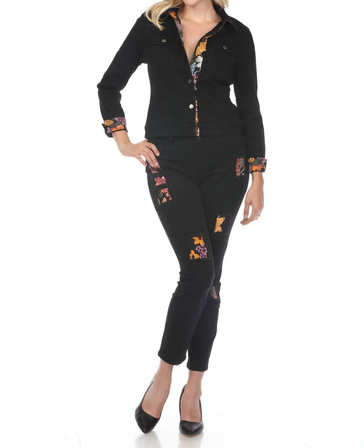 Add a playful, artistic touch to your wardrobe with these denim jeans, featuring vibrant embroidered floral patches for bold contrast. Designed with a slim, flattering fit, they’re perfect for everyday wear and effortless styling. Pair with a simple top or the matching embroidered denim jacket for a coordinated statement look that combines comfort with standout style.