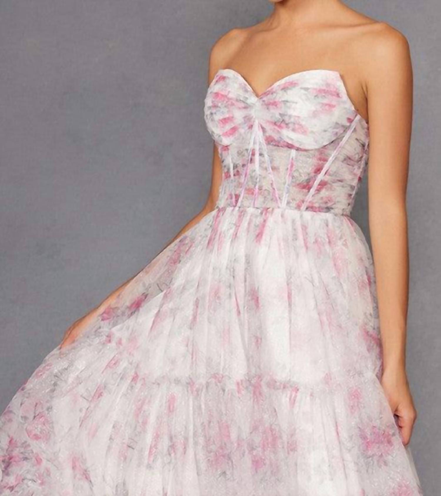 Introducing the Exclusive Glamour Sweetheart Floral Gown by Babyfox, a stunning pink creation perfect for prom. This strapless gown features a captivating sweetheart neckline and a pleated front that flows into a tiered skirt. Designed for a fit and flare silhouette, it captures the essence of spring with its floral pattern. Please note, wash and dry instructions are not available.