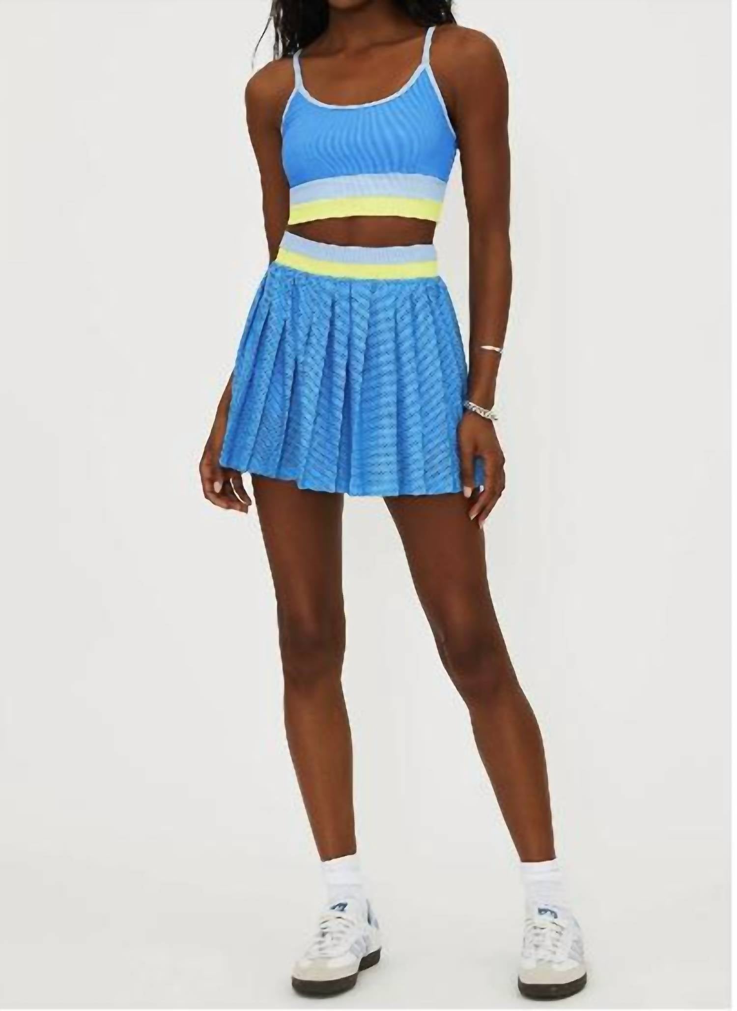 The Irina Skirt is made from a soft and flexible blend of 85% polyester and 15% spandex, designed for both comfort and movement. It features a convenient pull-on style with an elastic waistband for a secure fit. The skirt includes a short lining beneath a lightweight mesh overlay, creating a layered, airy look. An interior pocket adds functional detail, while the pleated midweight jersey fabric enhances its sporty yet feminine appeal.