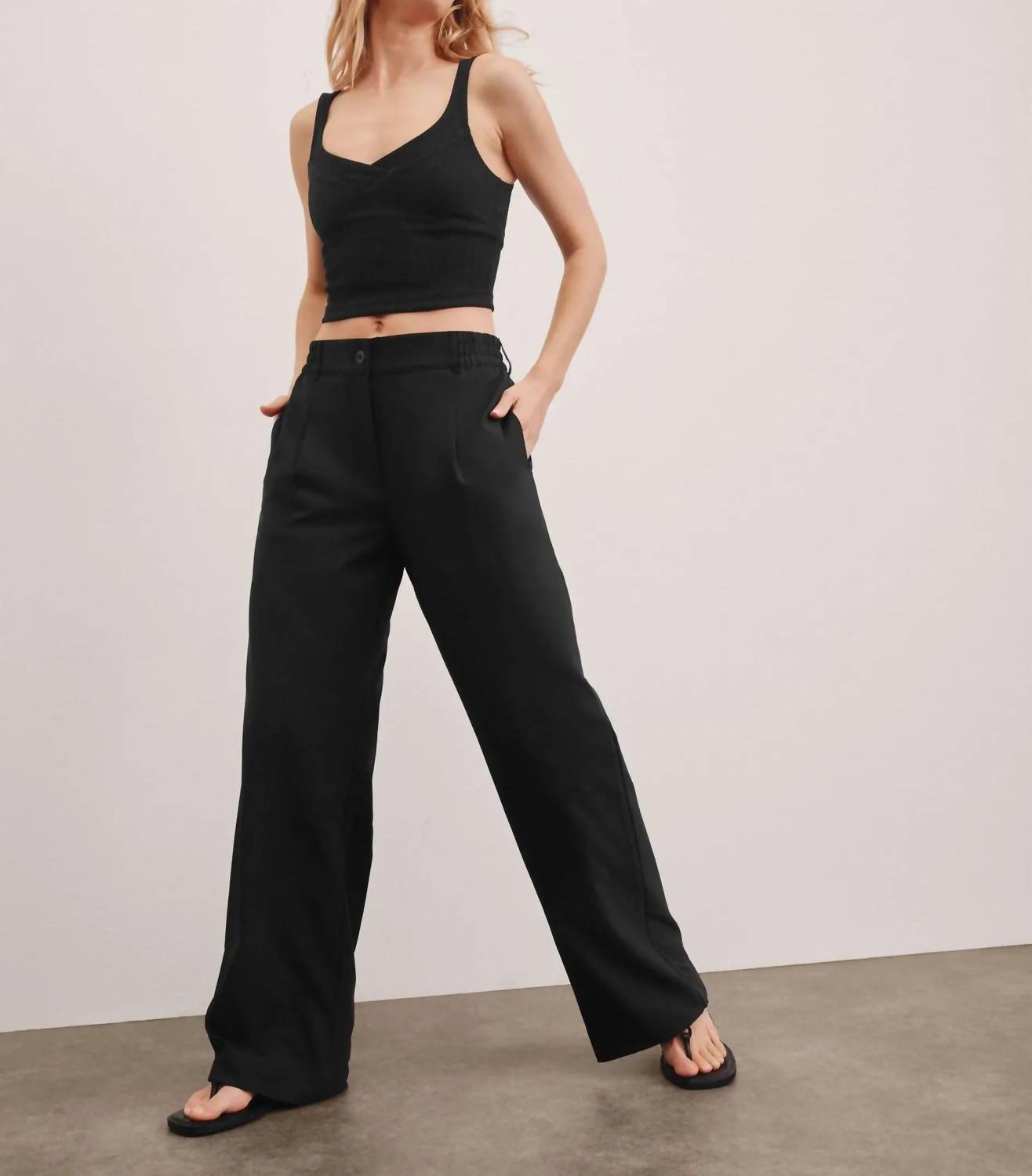 Elevate your wardrobe with the Status Wide Leg Trousers by BEYOND YOGA, crafted in sleek black. Featuring a 31" inseam, these trousers offer a flattering regular fit with a mid-rise and wide-leg silhouette. Made from 100% Polyester, they boast a super-soft athleisure fabric that combines the look of tailored trousers with the feel of easy comfort. Equipped with an elasticated waistband, belt loops, side seam pockets, a back welt pocket, and a front zipper fly with a button closure, these trousers ensure both style and functionality. Perfect for a minimalist spring aesthetic or a chic holiday party look.