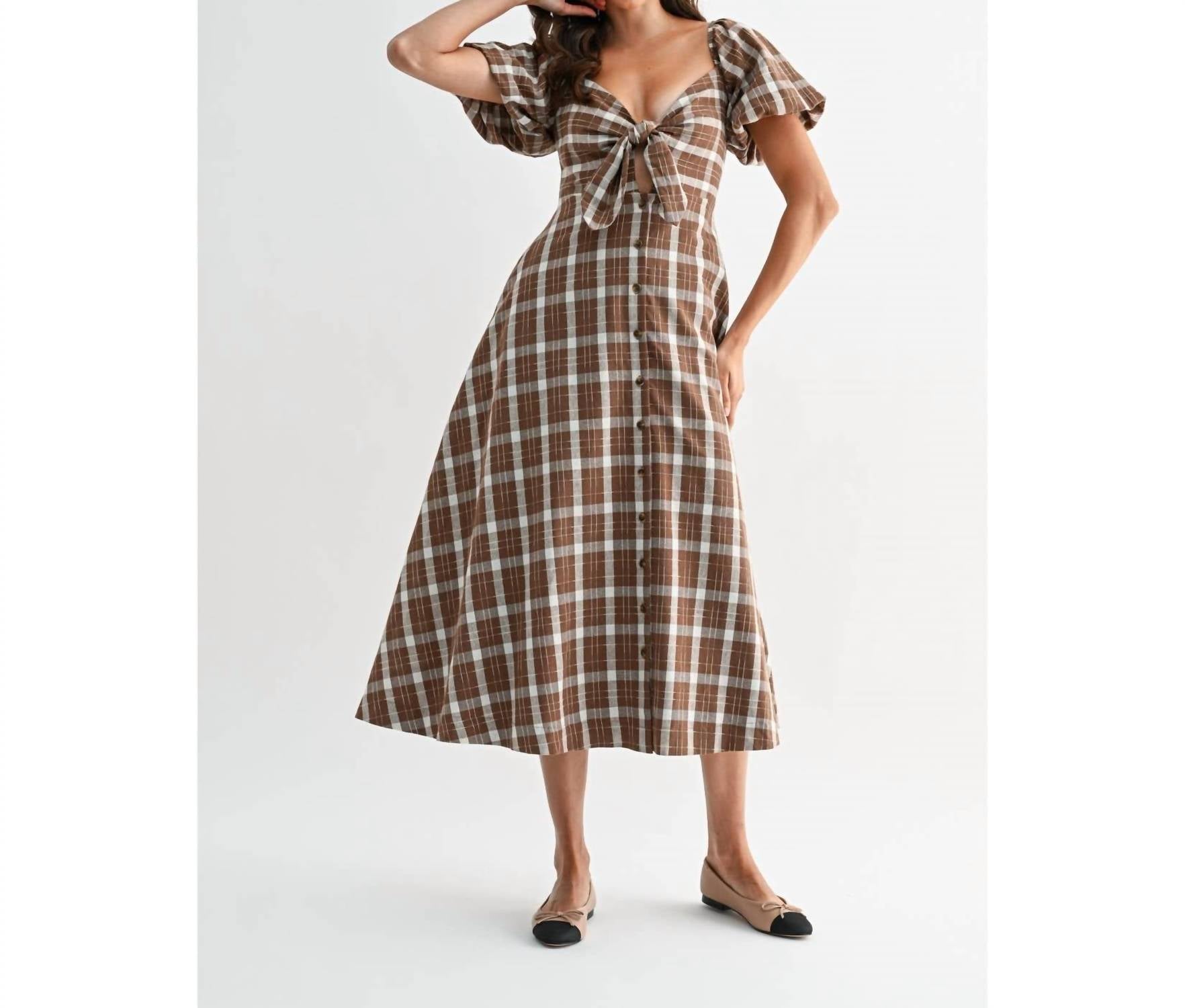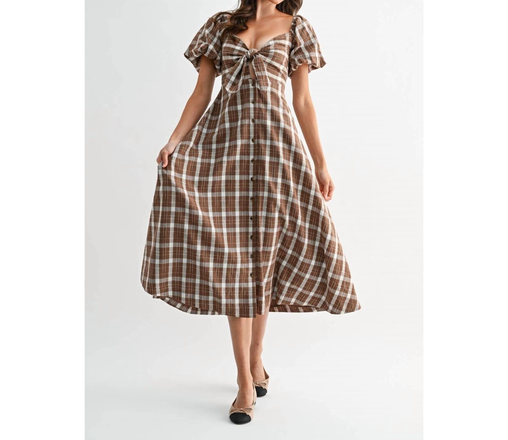 The Jori Plaid Tie Front Midi Dress by Camellia delivers a touch of vintage charm, perfect for a holiday party like Thanksgiving. Featuring short puff sleeves and a structured silhouette, this dress boasts a feminine tie-front detail and smocking across the back. Crafted with a self-material of 100% Cotton and a lining of 100% Rayon, this brown plaid dress guarantees comfort and style. The button closure enhances its classic look, while its A-line shape and sweetheart neckline create an elegant silhouette ideal for spring occasions.